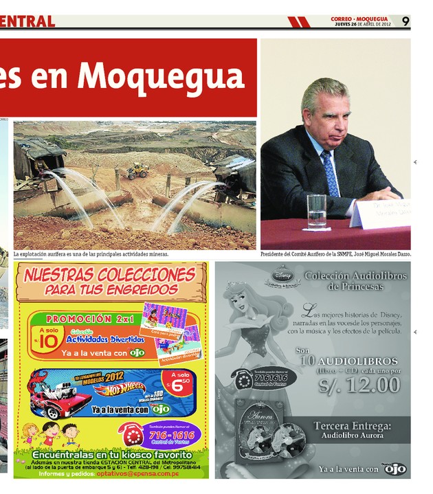 Sociedad Nacional de Mineria, Energía y Petroleo destaca la riqueza de la región. Invertirán $1,500 millones en Moquegua. Publica el diario Correo de Moquegua en sus páginas 8 y 9 de la edición del jueves 26 de abril.