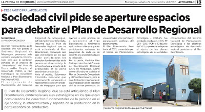 Sociedad civil pide se aperture espacios para debatir el Plan de Desarrollo Regional. Debe participar la población. Publica el diario La Prensa Regional de Ilo en su página 13 de la edición del sábado 22 de septiembre.