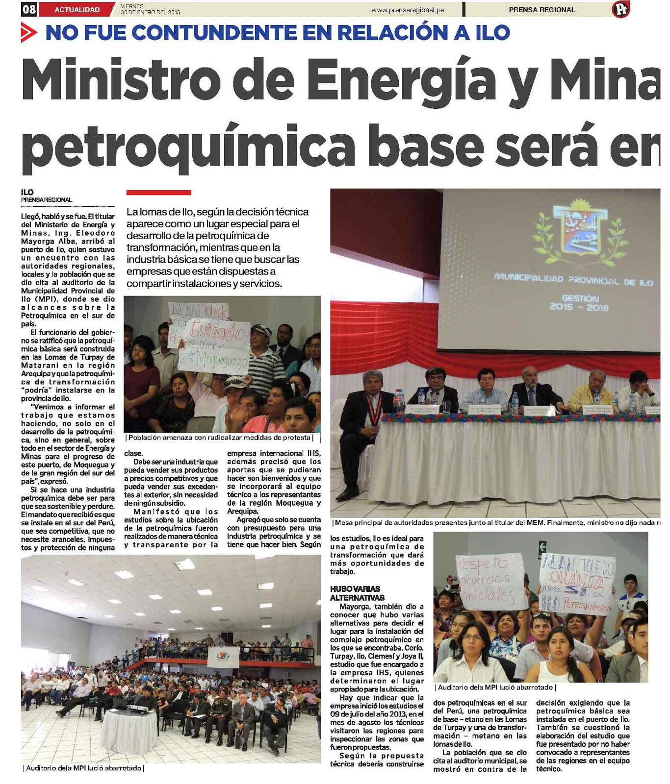 Ministro de Energía y Minas ratifica que petroquímica base será en Matarani. No fue contundente en relación a Ilo. Publica el diario La Prensa Regional de Islay en su página 7 de la edición del viernes 30 de enero.